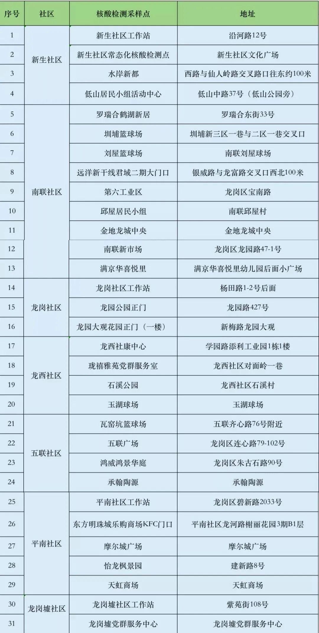 根據(jù)疫情防控需要,為最大程度保障人民群眾生命安全和身體健康,龍崗區(qū)各街道于1月10日開展新一輪免費(fèi)核酸檢測以下點位統(tǒng)計截至1月10日。各點位動態(tài)更新請以社區(qū)通知及現(xiàn)場實際情況為準(zhǔn)。
