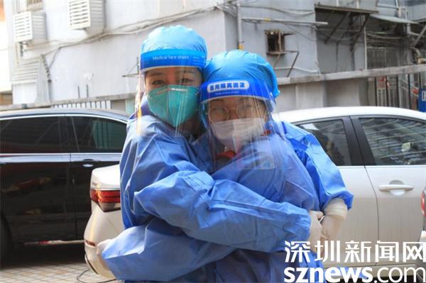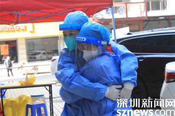 1月11日,深圳突然降溫,風大天冷。北風呼嘯中,羅湖區(qū)桂園街道老圍社區(qū)禧程酒店的臨時檢測點帳篷差點被掀翻。寒風刺骨,社區(qū)工作人員和志愿者有條不紊地引導市民有序采樣。工作人員在“風口浪尖”上站得久了,被吹得全身透涼,手指頭都冷僵了。瞬間,兩名志愿者緊緊擁抱在一起,相互取暖,以示鼓勵。隨后,又立刻回到各自崗位,投入緊張的工作中。
