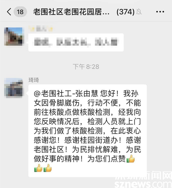 讀特客戶(hù)端·深圳新聞網(wǎng)2022年7月14日訊(記者 劉嘉敏 通訊員 楊紀(jì)歐)7月12日晚上8點(diǎn)多,羅湖區(qū)桂園街道老圍社區(qū)的居民琦琦在居民微信群里向社工張由慧說(shuō):“您好!我孫女因骨腳崴傷,行動(dòng)不便,不能前往核酸點(diǎn)做核酸檢測(cè),經(jīng)我向您反映情況后,檢測(cè)人員就上門(mén)為我們做了核酸檢測(cè),在此衷心感謝您!感謝桂園街道辦!感謝老圍社區(qū)!為民排憂(yōu)解難,為民做好事的精神!為你們點(diǎn)贊。”