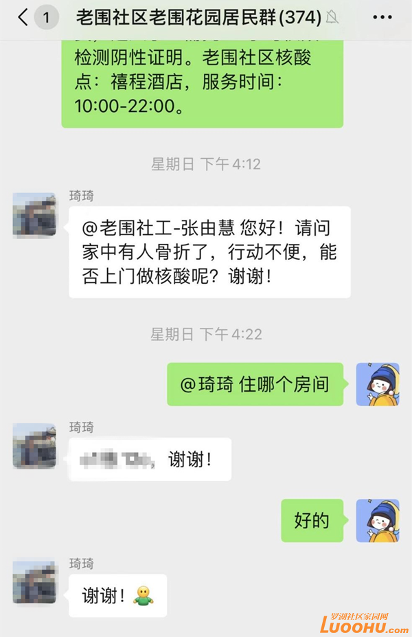 事情還要從7月10日的下午說(shuō)起,正在家休息的張由慧,看到琦琦在社區(qū)居民群里求助:“@老圍社工-張由慧?您好!請(qǐng)問(wèn)家中有人骨折了,行動(dòng)不便,能否上門(mén)做核酸呢?謝謝!”張由慧立刻回復(fù):“您的房間號(hào)(是什么)?”得到房間號(hào)后,張由慧通知社區(qū)網(wǎng)格員肖祥昌協(xié)助核實(shí)情況。肖祥昌從網(wǎng)格系統(tǒng)中找到琦琦的聯(lián)系方式,一通電話(huà)后,了解到琦琦的孫女不小心崴傷了腳,行動(dòng)不便,無(wú)法下樓做核酸。肖祥昌把情況通報(bào)給張由慧,張由慧立刻向社區(qū)黨委副書(shū)記黃小龍做了報(bào)備。