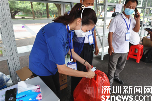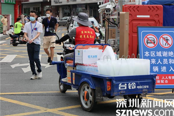 在新平村口,記者看到村口外圍已用水馬進行合圍,來自街道、疾控、社區(qū)還有大望實業(yè)股份有限公司、梧桐山實業(yè)股份有限公司等單位的工作人員正在準(zhǔn)備開展工作。在合圍的多個出入口處設(shè)置了快遞、外賣投放點,由防疫人員為中、高風(fēng)險的居民送貨上門。