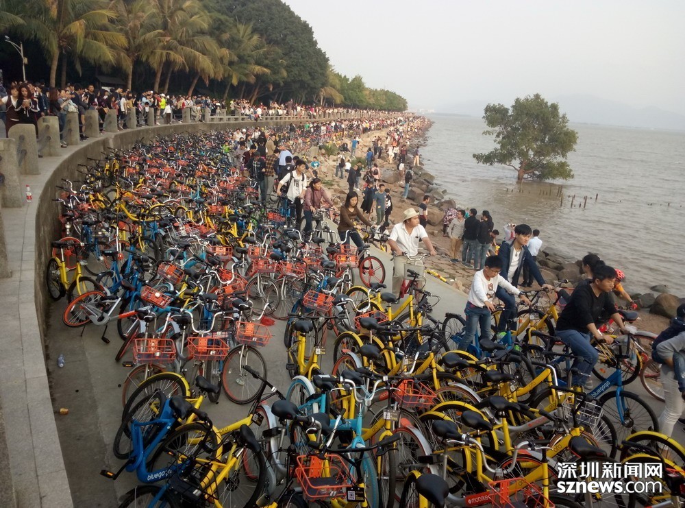深圳人假日勤動(dòng)腳,深圳灣公園被自行車堵了。