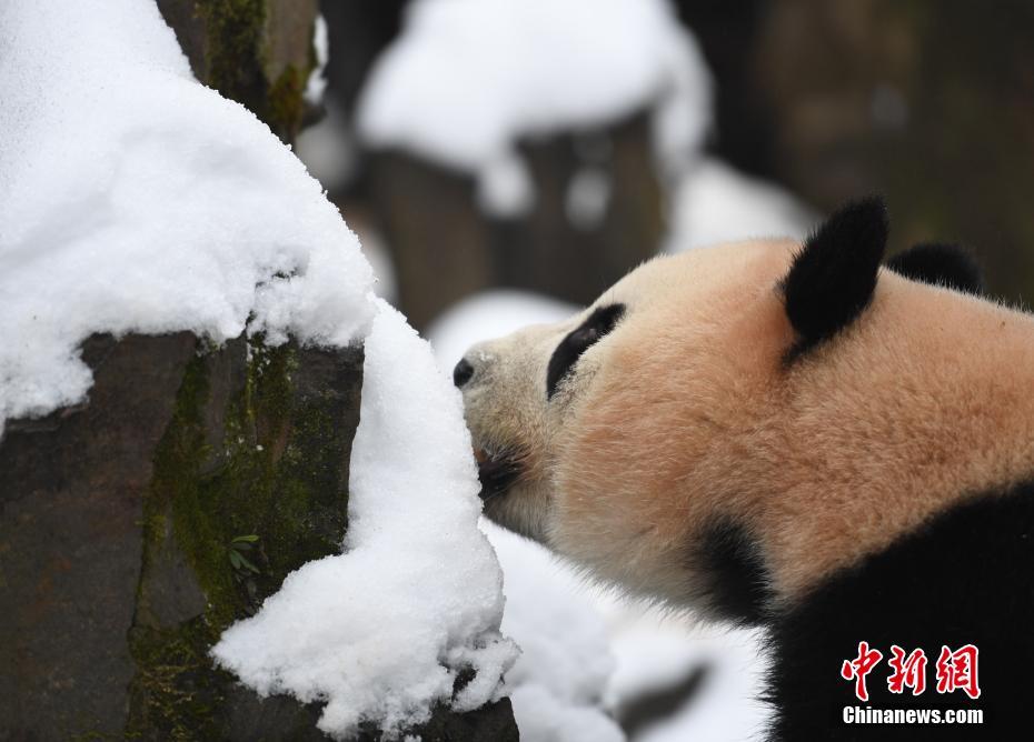 浙江杭州大熊貓雪地里活動進(jìn)食憨萌可掬