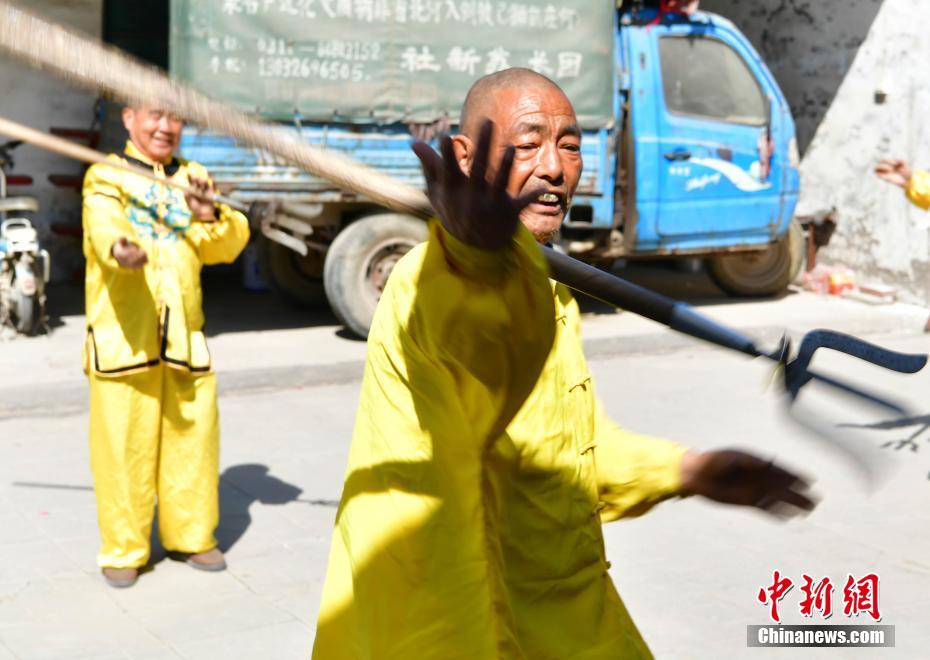 4月11日,在河北趙縣何莊,農(nóng)民蘇煥未(右)正在示范,并教授徒弟們“滾鋼叉”技藝。67歲的蘇煥未出身武術(shù)世家,自幼練就一手出神入化的滾鋼叉絕技。滾鋼叉又叫鋼叉舞、耍鋼叉,以表演驚險(xiǎn)著稱。老人的表演出神入化,鋼叉能耍出空中飛叉、滾蹚紅、金鉤釣魚(yú)、穿脖穿腰等十幾種花樣。蘇煥未表示,滾鋼叉因?yàn)榫毩?xí)非常辛苦,很少有年輕人愿意學(xué),他希望該民間技藝得到相關(guān)部門(mén)保護(hù)。中新社記者翟羽佳 攝
