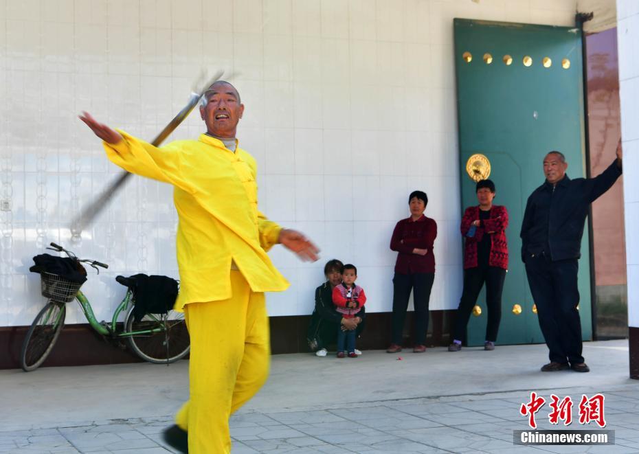 4月11日,在河北趙縣何莊,農(nóng)民蘇煥未(左一)的“滾鋼叉”技藝表演吸引了圍觀者的眼球。67歲的蘇煥未出身武術(shù)世家,自幼練就一手出神入化的滾鋼叉絕技。滾鋼叉又叫鋼叉舞、耍鋼叉,以表演驚險著稱。老人的表演出神入化,鋼叉能耍出空中飛叉、滾蹚紅、金鉤釣魚、穿脖穿腰等十幾種花樣。蘇煥未表示,滾鋼叉因為練習非常辛苦,很少有年輕人愿意學,他希望該民間技藝得到相關(guān)部門保護。中新社記者翟羽佳 攝
