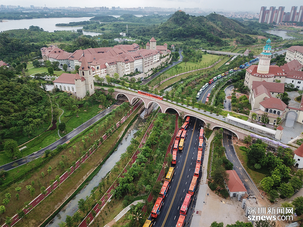 專為家住深圳的員工準(zhǔn)備的通勤大巴整齊停在道路兩側(cè)