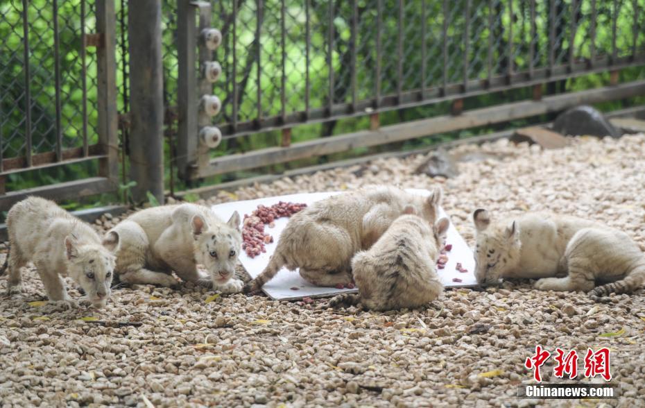 7月10日,雪虎五胞胎分享“肉餡蛋糕”。當(dāng)日,濟(jì)南野生動(dòng)物世界五胞胎雪虎誕生滿百日,正式與游客見面。中新社記者 張勇攝