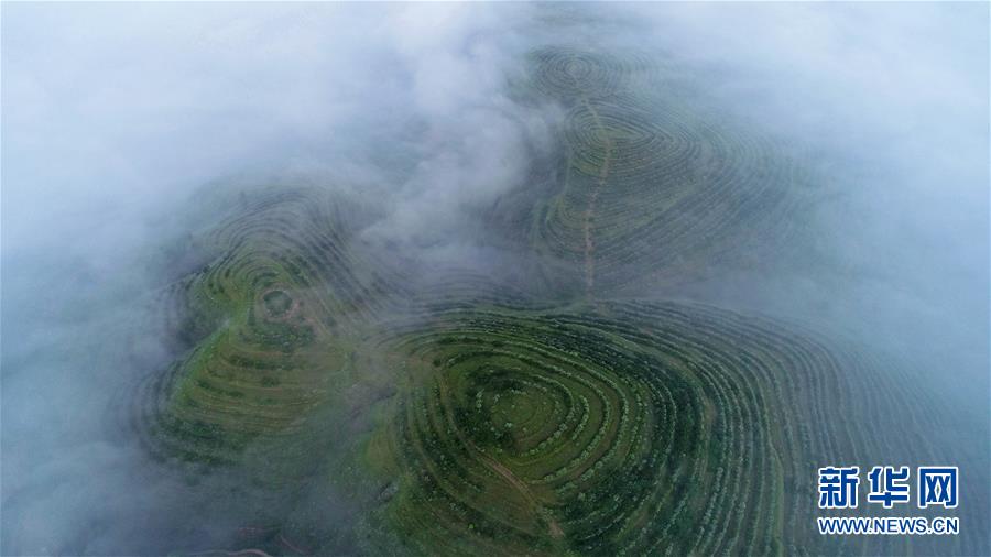 云霧繚繞的寧夏彭陽(yáng)縣金雞坪梯田公園(7月17日無(wú)人機(jī)拍攝)。 新華社記者 王鵬 攝
