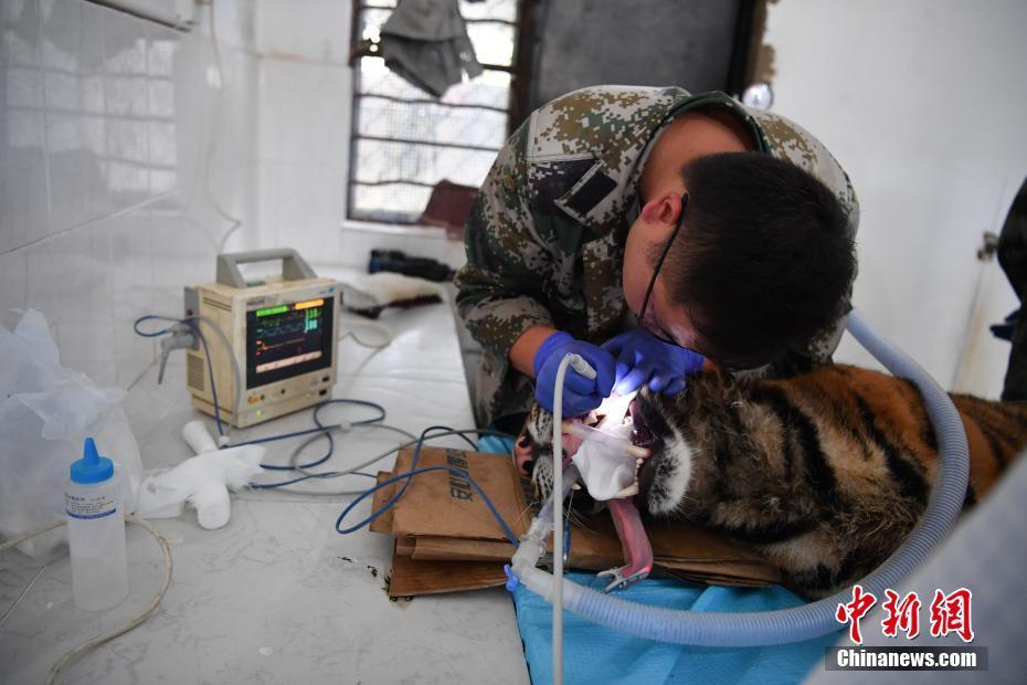 8月9日,獸醫(yī)為老虎洗牙,旁邊有心電監(jiān)護儀隨時監(jiān)測老虎身體狀況。當日,位于昆明的云南野生動物園獸醫(yī)通過呼吸麻醉的方式,為園中一只一歲的老虎清潔牙。中新社記者 劉冉陽 攝