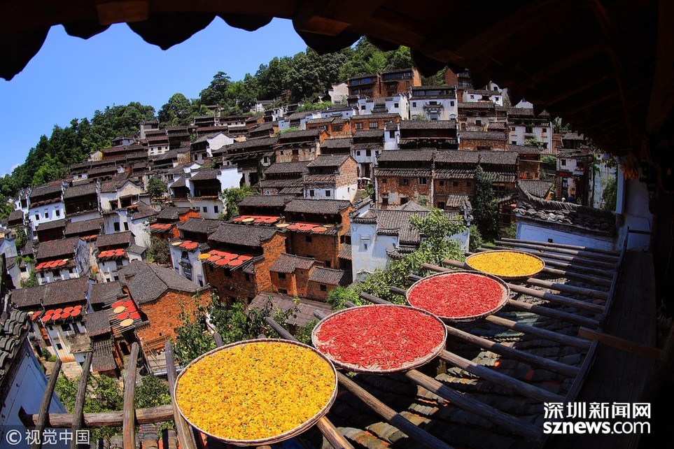 ??? 深圳新聞網(wǎng)訊 2018年8月7日,江西婺源縣篁嶺古村落,壯觀“曬秋”場(chǎng)景。當(dāng)日立秋節(jié)氣,江西婺源縣篁嶺古村的農(nóng)作物普遍豐收,村民們又迎來(lái)了一年一度的“曬秋”季。村民們將收獲來(lái)的紅辣椒、玉米、南瓜、稻谷和菊花等色彩斑斕的農(nóng)作物,晾曬在依山而建的徽派民居房前屋后的木制曬架上,在秋日陽(yáng)光的照射下,色彩繽紛圓圓的曬扁,鋪就在錯(cuò)落有致的徽派民居之間,格外璀璨奪目,蔚為壯觀。目前,“篁嶺曬秋”已經(jīng)成為中國(guó)鄉(xiāng)村旅游的一張名片。