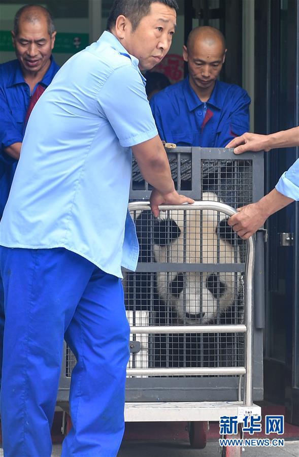 8月20日,工作人員推送大熊貓至運(yùn)輸車處。 新華社記者 許暢 攝