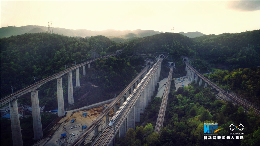 貴州省地處中國西南腹地,全省高原山地居多,因此高鐵建設(shè)的橋隧占比較高。在貴陽市烏當(dāng)區(qū)新添寨,高鐵滬昆線、貴廣客運(yùn)專線、貴開城際客運(yùn)專線的隧道和橋梁交織在一起,形成“五洞五橋”并行,形似“五龍出?!钡膲延^景象(3月29日攝)。新華網(wǎng)盧志佳 攝
