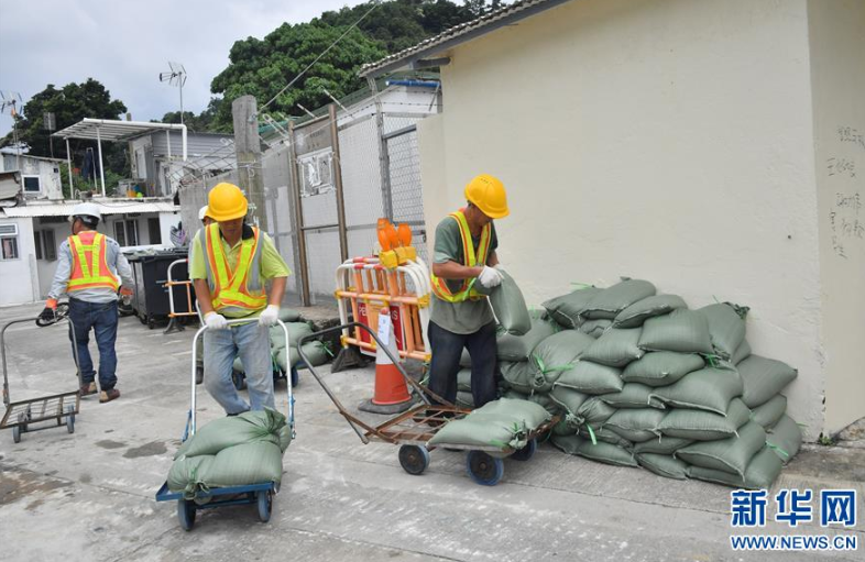 9月14日,工作人員在香港三家村放置沙包防止洪水。新華社記者呂小煒攝