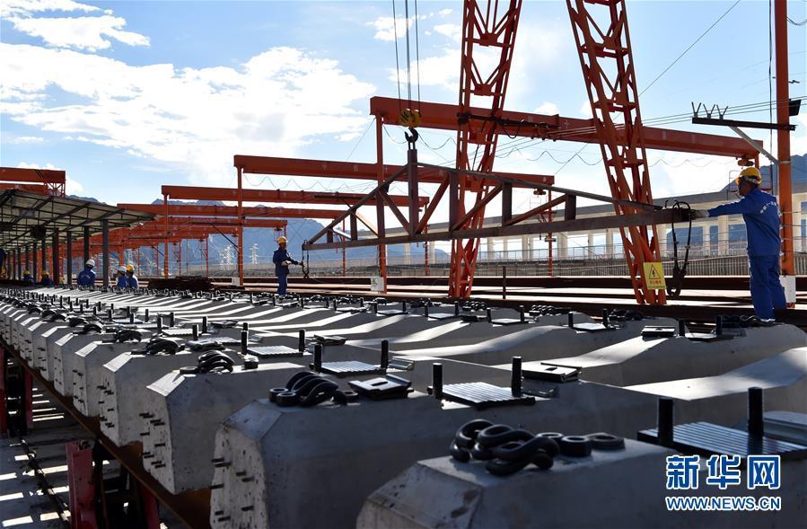 9月19日,在位于西藏拉薩曲水縣的中鐵十一局三公司協(xié)榮鋪架基地,用于架設(shè)川藏鐵路拉薩至林芝段(拉林鐵路)的首批軌排完成生產(chǎn)下線。據(jù)悉,拉林鐵路鋪軌任務(wù)全長(zhǎng)400余公里,需要生產(chǎn)軌枕44萬(wàn)多根。 新華社記者 覺(jué)果 攝