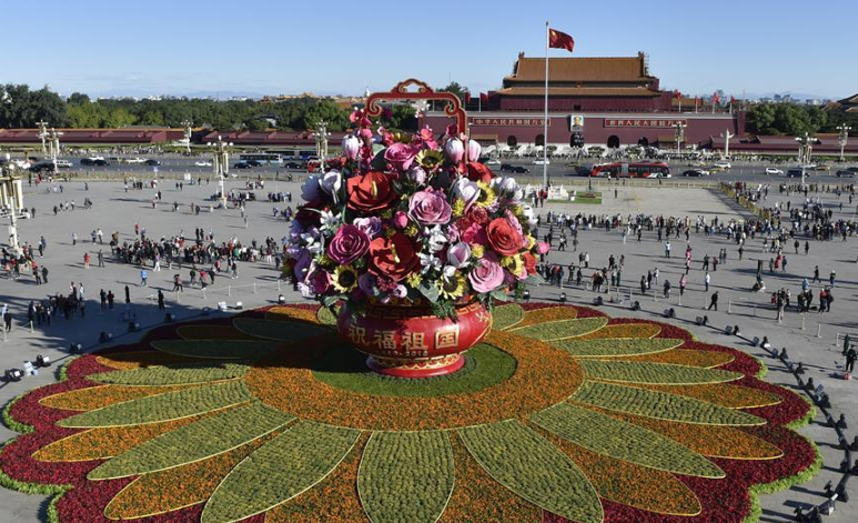 “祝福祖國”巨型花籃全面亮相