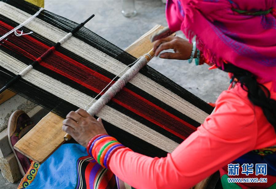員工卓瑪在鹽湖鄉(xiāng)羌麥村民族手工編織廠工作(9月19日攝)。 2018年,西藏阿里地區(qū)革吉縣鹽湖鄉(xiāng)政府自籌資金成立羌麥村民族手工編織廠,編織廠將當(dāng)?shù)貍鹘y(tǒng)手工編織技藝與市場需求相結(jié)合,生產(chǎn)手提包、圍脖、腰帶、毛毯、藏式頭巾等產(chǎn)品,并參加旅游推介活動,拓寬編織品銷售渠道,助力當(dāng)?shù)鼐用衩撠殹?新華社記者 劉東君 攝