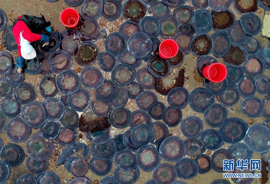 9月21日,灤南縣南堡鎮(zhèn)南堡二村一家海蜇養(yǎng)殖場(chǎng)的工人在海蜇鹵制池內(nèi)擺放海蜇(無人機(jī)拍攝)。新華社記者楊世堯攝