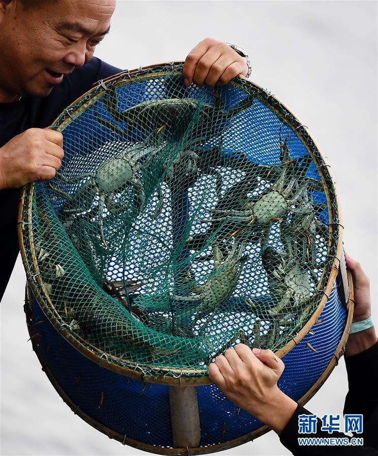 9月21日,蟹農(nóng)展示剛捕撈到的陽(yáng)澄湖大閘蟹。新華社記者李響攝