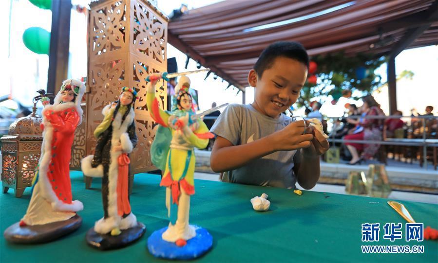 9月23日,在美國科斯塔梅薩南岸廣場,一名兒童在中秋游園會上學習捏面人。 美國西部最大購物中心南岸廣場23日晚舉辦游園會,慶祝中國傳統(tǒng)節(jié)日中秋節(jié)。 新華社記者李穎攝