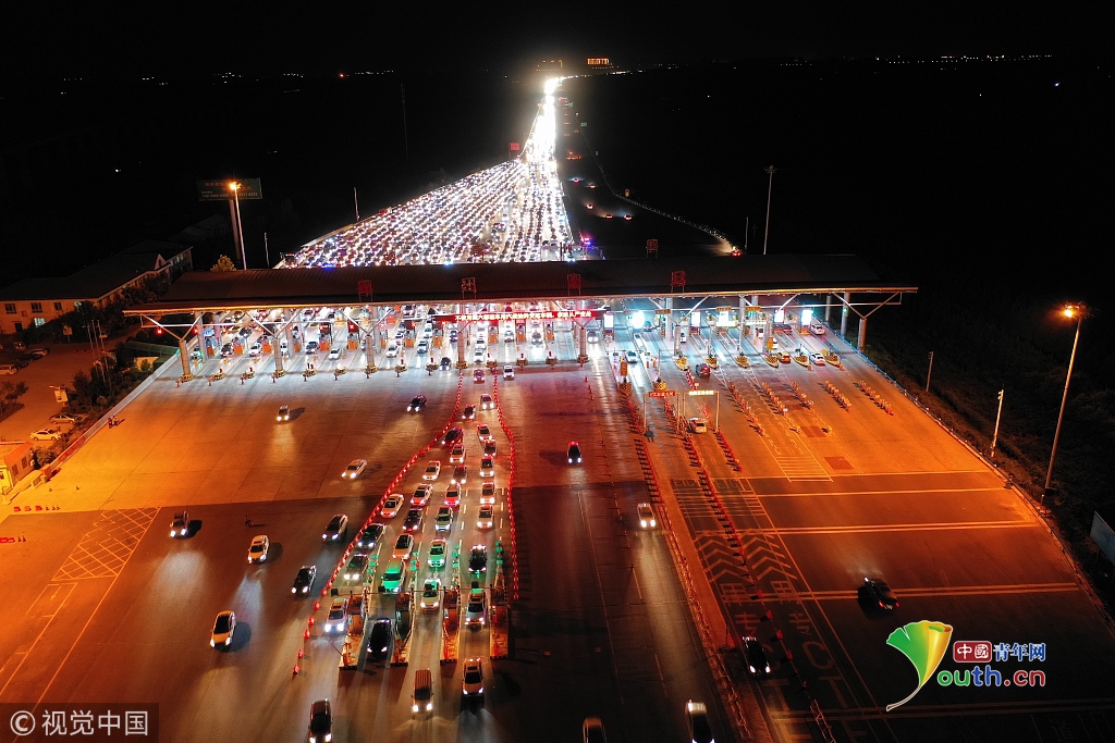 2018年9月24日,鄭州,在河南鄭州南收費站,排隊出高速的汽車仍然排著長長的隊伍。當(dāng)天是中秋節(jié)小長假的最后一天,全國各地迎來返程客流高峰。