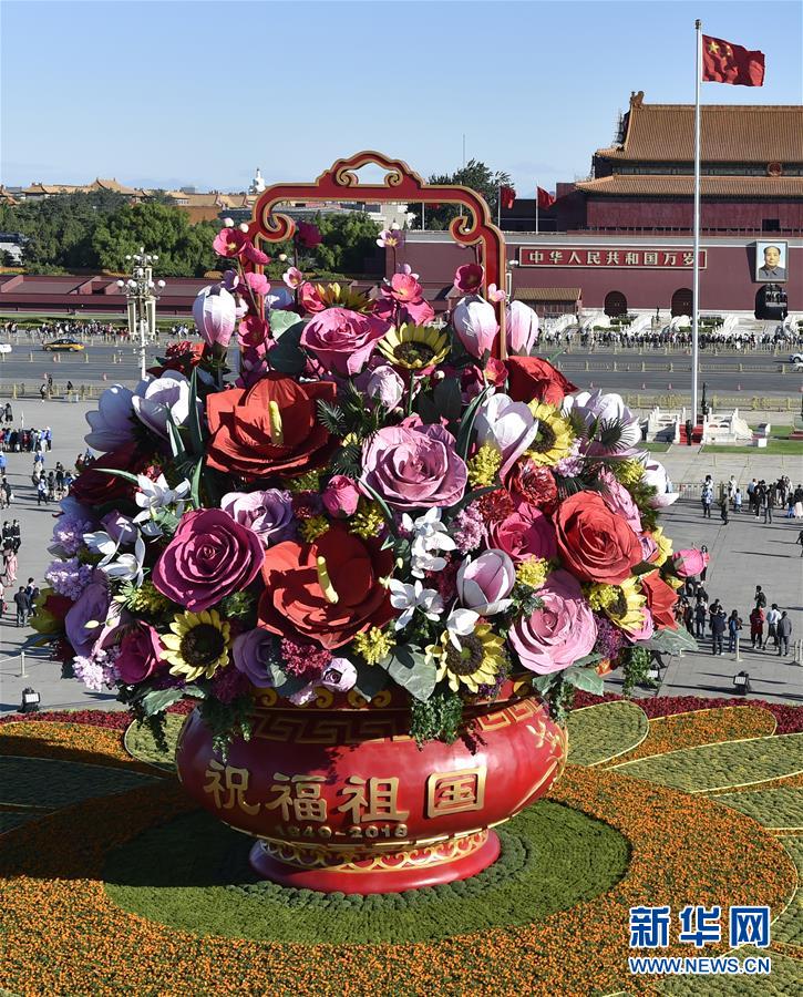 9月23日在北京天安門廣場拍攝的“祝福祖國” 巨型花籃。 新華社 李賀 攝