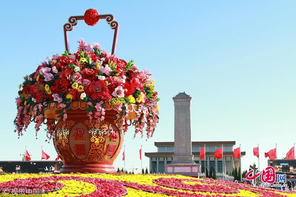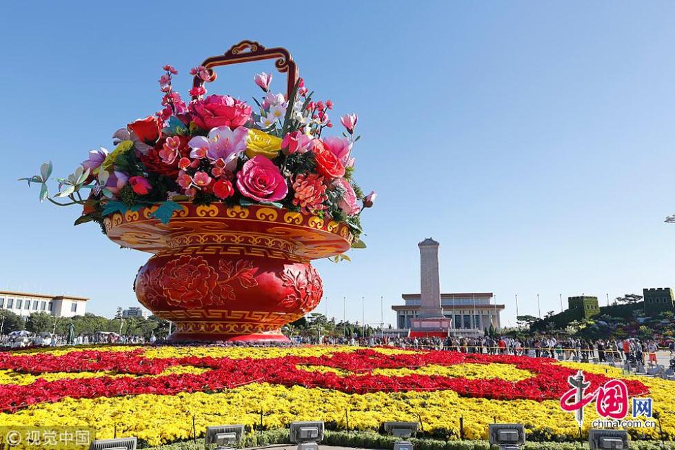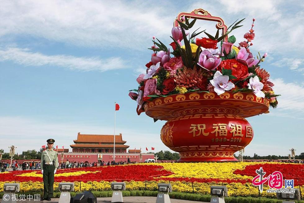 2011年10月04日,在北京蔚藍(lán)的天空下,“祝福祖國”的大型花壇屹立在天安門廣場中央。蘇陽攝影