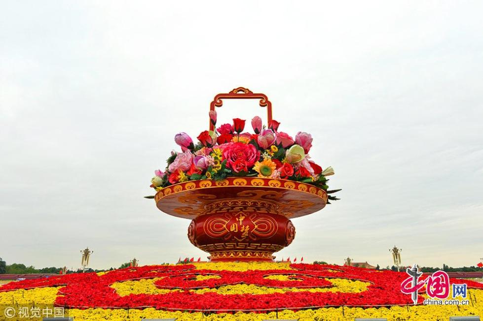 9月23日在北京天安門廣場拍攝的“祝福祖國” 巨型花籃。