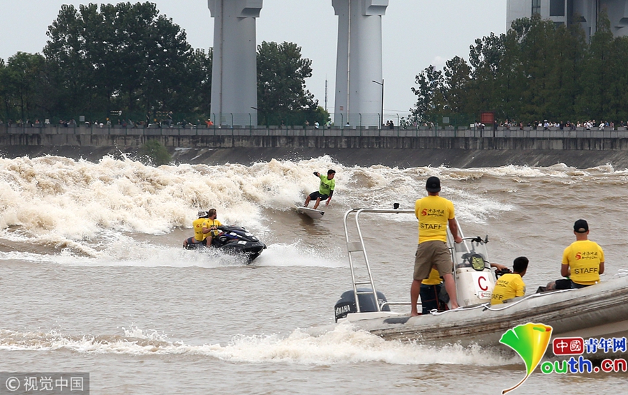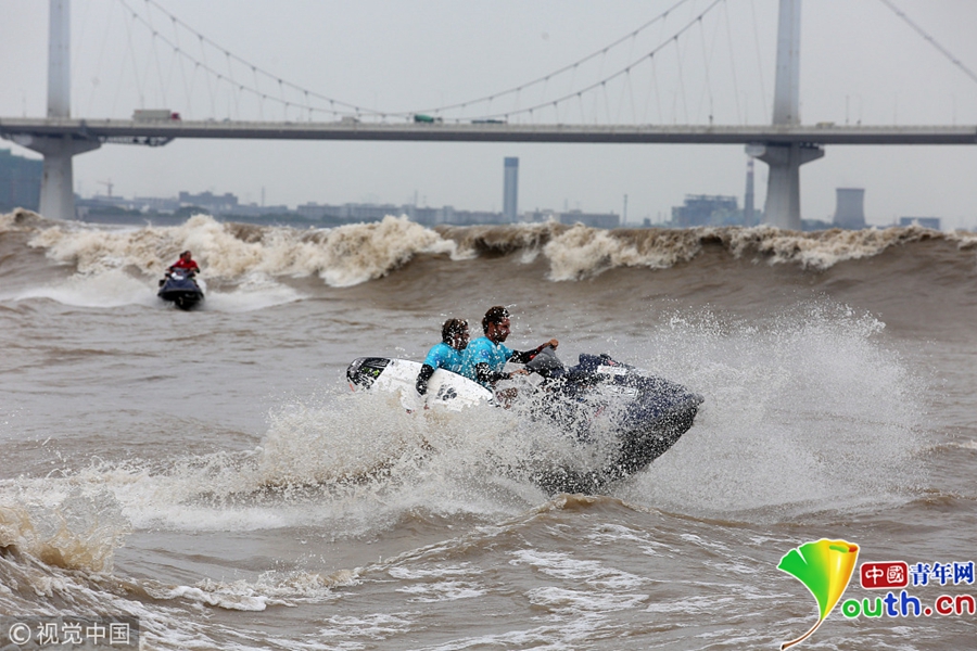 杭州錢江江面上,沖浪弄潮兒英姿颯爽。