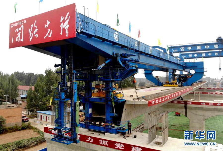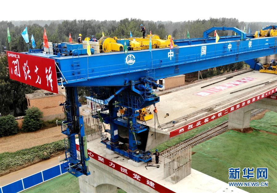 9月27日,中鐵二局的施工人員使用大型機械在鄭(州)濟(南)高速鐵路(鄭濮段)站前工程VI標施工現(xiàn)場架設40米簡支箱梁(無人機拍攝)。 新華社記者李安攝