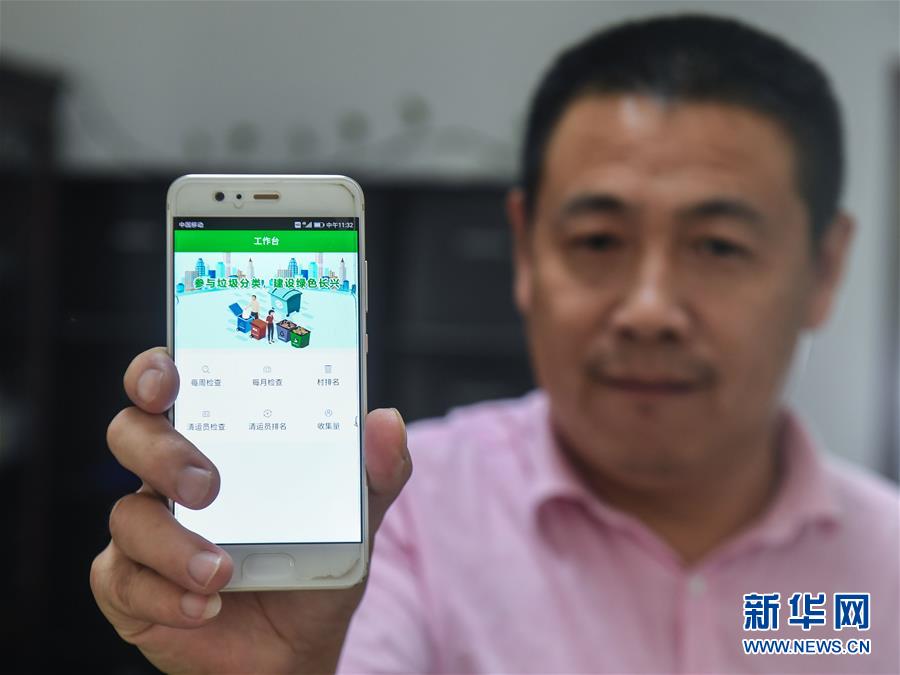 9月27日,工作人員展示垃圾分類APP的界面。從9月初開始,浙江省長興縣小浦鎮(zhèn)推廣使用手機(jī)垃圾分類智能管理平臺(tái)。通過這款A(yù)PP可以進(jìn)行村民垃圾分類情況打分、清運(yùn)員每日簽到、監(jiān)督員巡查等,并能即時(shí)生成農(nóng)戶垃圾分類“成績單”,所有農(nóng)戶均可通過APP查詢垃圾分類排行榜,既方便又環(huán)保。新華社記者 徐昱 攝