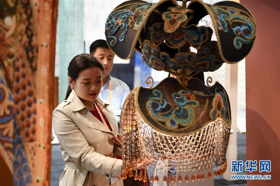 9月27日,在敦煌國(guó)際會(huì)展中心,參觀者欣賞展出的藝術(shù)品。