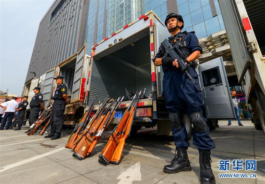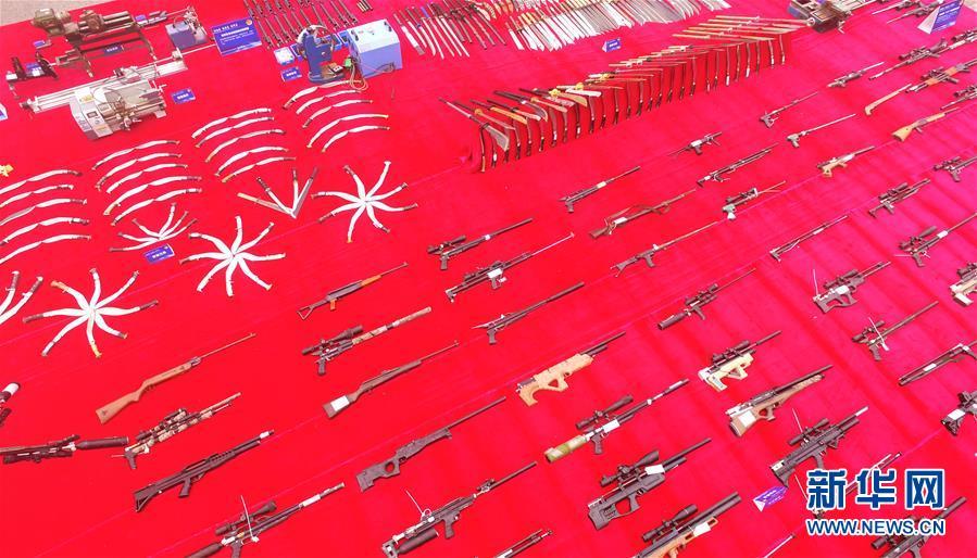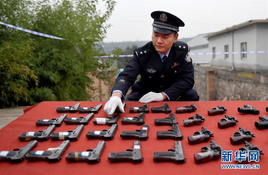 9月20日,在河北省邯鄲市天鴻廣場,警方展示即將銷毀的非法槍支。 新華社記者 王曉 攝