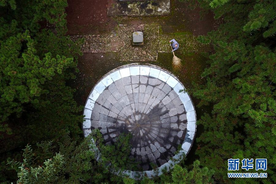 在黃崖洞烈士陵園,趙乃堂在清掃落葉(9月20日無(wú)人機(jī)拍攝)。 新華社記者 詹彥 攝