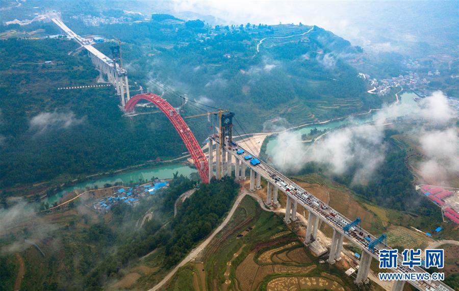 9月12日使用無人機拍攝的大小井特大橋。 目前,橫跨在貴州省羅甸縣大井河上的大小井特大橋建設進入沖刺階段。大小井特大橋全長1.5公里,主跨450米,是世界最大跨徑上承式鋼管混凝土拱橋。據(jù)了解,該橋是平塘至羅甸高速公路關鍵性工程,對打通貴州“斷頭路”,助推滇黔桂石漠化片區(qū)脫貧攻堅具有重要意義。 新華社記者劉續(xù)攝