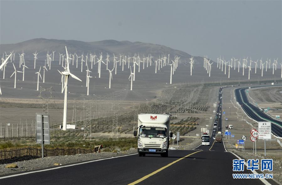 汽車行駛在新疆吐魯番市郊區(qū)風(fēng)力發(fā)電場一旁的公路上(9月22日攝)。新華社記者趙戈 攝