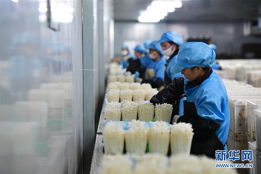 在位于清豐縣的河南龍豐實(shí)業(yè)股份有限公司,工人在包裝車間流水線上采摘、分揀金針菇(9月28日攝)。新華社記者馮大鵬攝