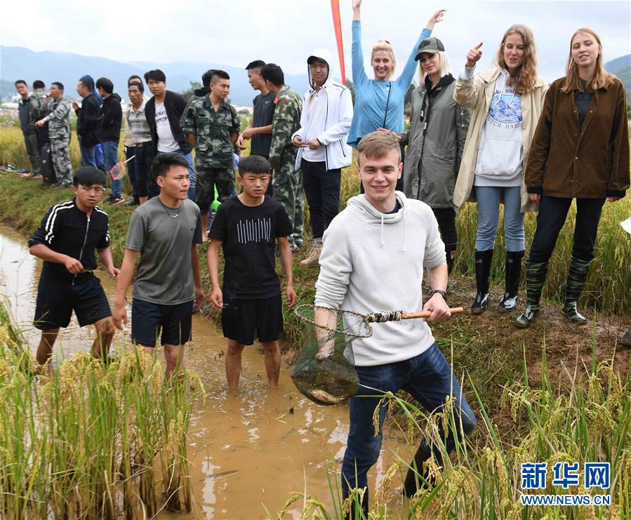 9月29日,外國游客體驗(yàn)摸魚。9月29日,云南省尋甸回族彝族自治縣2018年首屆農(nóng)民豐收節(jié)暨第二屆摸魚節(jié)在雞街鎮(zhèn)舉行,當(dāng)?shù)剞r(nóng)民和游客在豐收的稻田里進(jìn)行摸魚、拔谷穗、山歌對唱等活動,享受收獲的喜悅。新華社記者楊宗友攝