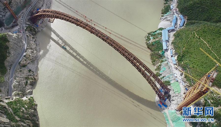 9月28日無人機(jī)拍攝的川藏鐵路拉林段重點(diǎn)標(biāo)志性工程藏木特大橋。 當(dāng)日,隨著最后一節(jié)鋼管拱的對(duì)位和鎖定完畢,川藏鐵路拉林段藏木特大橋成功合龍,標(biāo)志著大橋主體結(jié)構(gòu)施工取得了關(guān)鍵性勝利。藏木特大橋由中國(guó)中鐵廣州局集團(tuán)承建,拱高112米,橋橫跨雅魯藏布江峽谷,水深66米。 新華社記者普布扎西攝