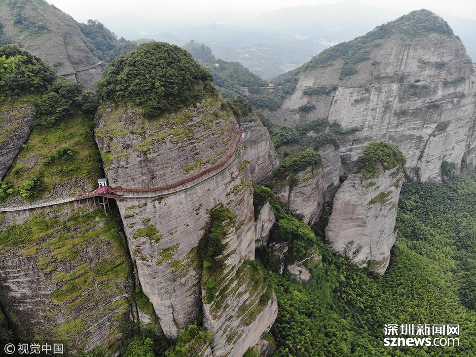 深圳新聞網(wǎng)訊 2018年6月19日,航拍江西贛州南武當(dāng)山百米高空玻璃棧道。棧道緊貼峭壁,在懸崖之上凌空蜿蜒穿行,猶如一條玉龍盤(pán)旋在綠林石海之中。 南武當(dāng)山位于江西最南端的龍南縣武當(dāng)鎮(zhèn)境內(nèi),景區(qū)核心面積達(dá)到13.5平方公里,擁有99座千姿百態(tài)的巍峨石峰,丹霞地質(zhì)風(fēng)貌突出,連綿十里,被稱(chēng)為“武當(dāng)十里畫(huà)廊”。