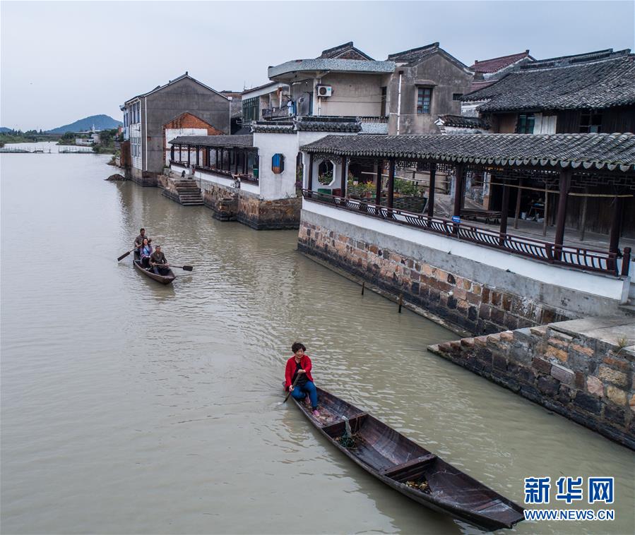 10月10日,泉家潭村村民劃著小船經(jīng)過沿河長廊(無人機(jī)拍攝)。經(jīng)過改造提升后,沿河長廊和整潔的古村街巷成為當(dāng)?shù)孛利愢l(xiāng)村的景觀帶。 新華社記者 徐昱