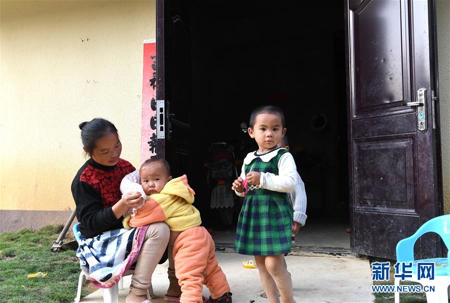 白褲瑤族同胞黎明妹在廣西南丹縣里湖瑤族鄉(xiāng)移民集中安置點(diǎn)的新家前照看孩子(10月11日攝)。新華社記者 周華 攝