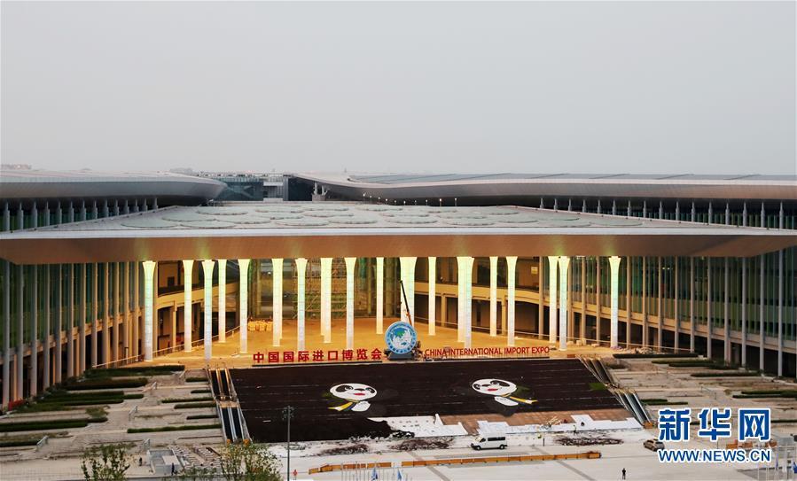 2018年9月30日,中國(guó)國(guó)際進(jìn)口博覽會(huì)舉辦地國(guó)家會(huì)展中心(上海)南廣場(chǎng)燈光柱亮起,吉祥物“進(jìn)寶”的圖案也裝飾到位。