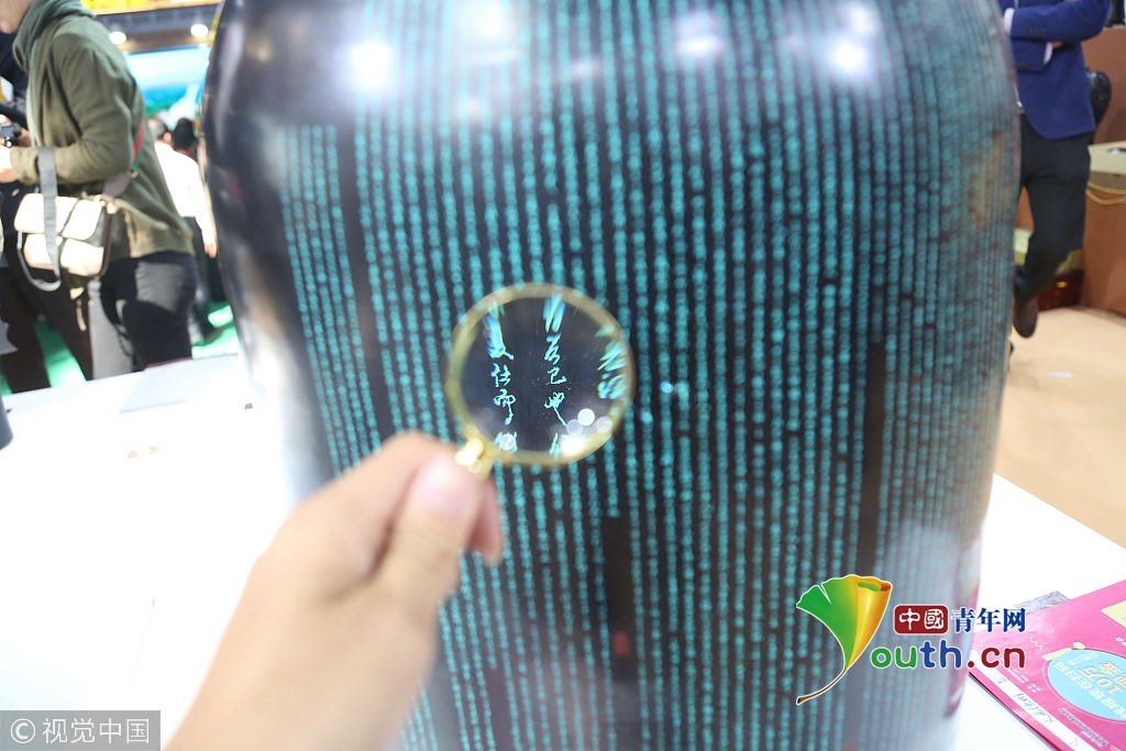 2018年10月14日,山東濟(jì)南,高新會(huì)展中心濟(jì)南文博會(huì)現(xiàn)場,張務(wù)福老先生在黑陶鼎上刻字。