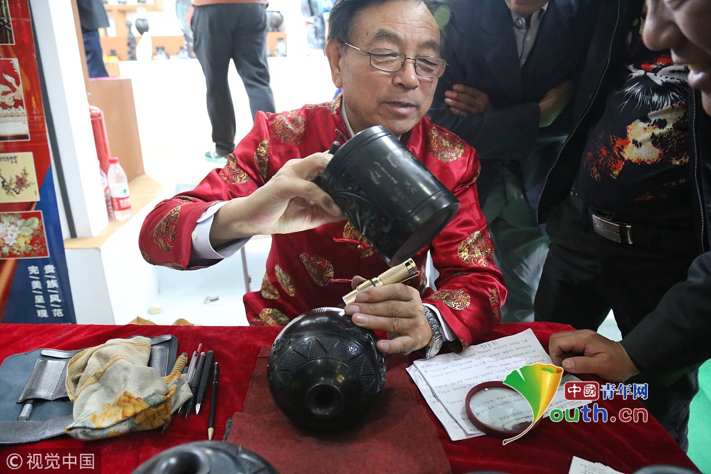 濟(jì)南一大爺黑陶鼎上刻字 1個(gè)字不到1毫米需用放大鏡看