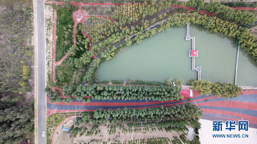 俯瞰恩格貝月亮湖。(新華網(wǎng) 王宇 攝)