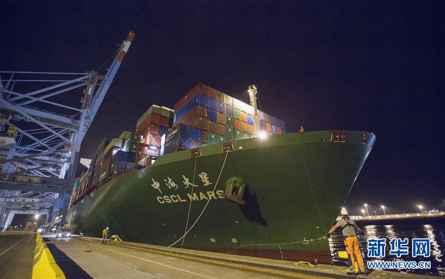 10月15日晚,中遠(yuǎn)海運(yùn)旗下的“中海火星”號(hào)集裝箱輪??吭诒壤麜r(shí)澤布呂赫港集裝箱碼頭。 新華社記者 葉平凡 攝