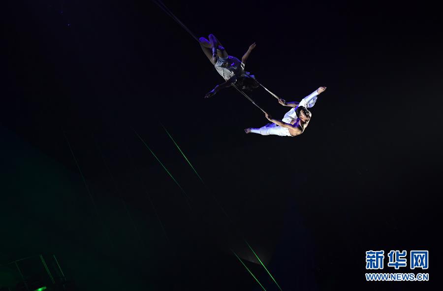 10月16日,演員在濮陽(yáng)國(guó)際雜技藝術(shù)節(jié)上表演雜技《男女雙人秋千》。 新華社記者 朱祥 攝