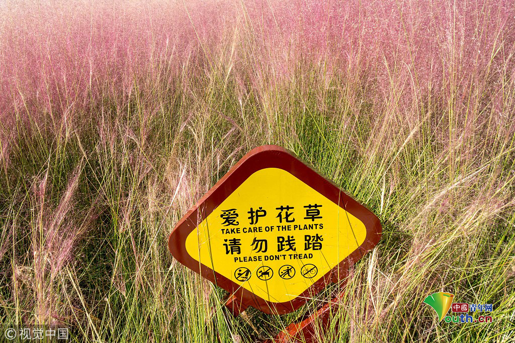 2018年9月28日,上海,東外灘楊浦濱江的粉黛亂子草目前已進(jìn)入盛花期,當(dāng)日早間,不少市民來(lái)到濱江拍照賞景,成片的紫色花海在藍(lán)天白云映襯下美不勝收。圖片作者:王岡/視覺中國(guó)