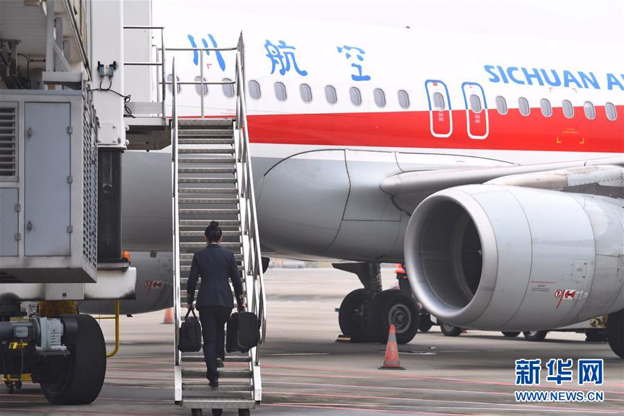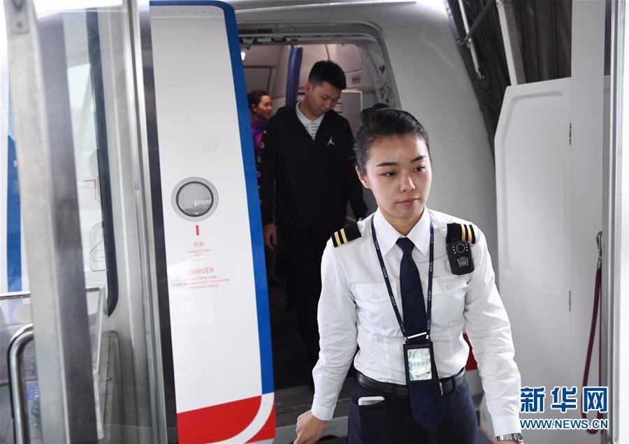 10月16日,航班抵達(dá)重慶江北國(guó)際機(jī)場(chǎng)后,湯春燕第一個(gè)走出艙門,準(zhǔn)備迎接旅客下機(jī)。 新華社記者王全超攝