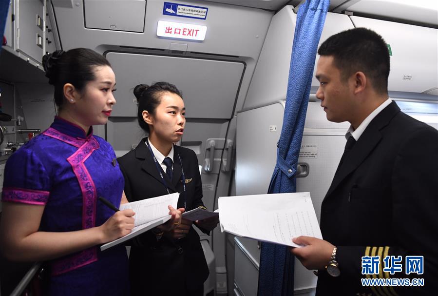 10月16日,湯春燕對(duì)飛機(jī)客艙進(jìn)行安保檢查。 新華社記者王全超攝